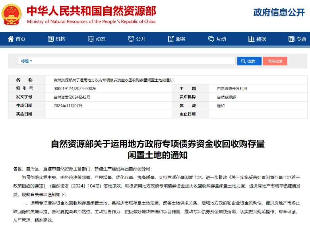 11月11日,自然資源部發(fā)布關(guān)于運用地方政府專(zhuān)項債券資金收回收購存量閑置土地的通知,土地儲備機構委托經(jīng)備案的土地估價(jià)機構,對擬收回收購地塊開(kāi)展土地市場(chǎng)價(jià)格評估,相較企業(yè)土地成本,就低確定收地基礎價(jià)格。市、縣處置存量閑置土地協(xié)調推進(jìn)機制或土地出讓協(xié)調決策機構根據市場(chǎng)形勢、合同履約情況等,集體決策確定基礎價(jià)格下調幅度,經(jīng)與土地使用權人協(xié)商一致并經(jīng)公示無(wú)異議后,報市、縣人民政府批準確認。在約定期限內未完成收回收購的,應當按照上述程序重新確定價(jià)格。收回收購的土地原則上當年不再供應用于房地產(chǎn)開(kāi)發(fā)。確有需求的,應當嚴控規模,優(yōu)化條件實(shí)施供應,在落實(shí)“五類(lèi)調控”的同時(shí),供應面積不得超過(guò)當年收回收購房地產(chǎn)用地總面積的50%。收回收購土地用于民生領(lǐng)域和實(shí)體經(jīng)濟項目的,不受上述限制。